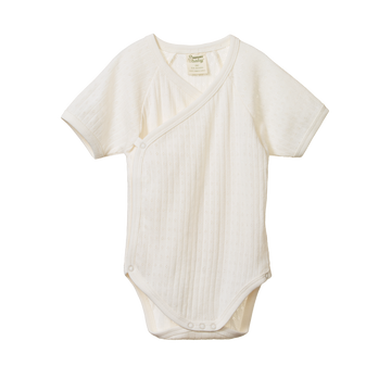 Our much loved Kimono Bodysuit is a great option for newborns as you avoid pulling garments over baby's head. Easy to fasten with snap domes on the inside and outside as well as the crotch and outside leg. A perfect bodysuit for summer babies! Made in our beautiful pointelle fabric which has a nostalgic quality and is super soft and stretchy. To minimise shrinkage, this fabric has been pre-washed.
