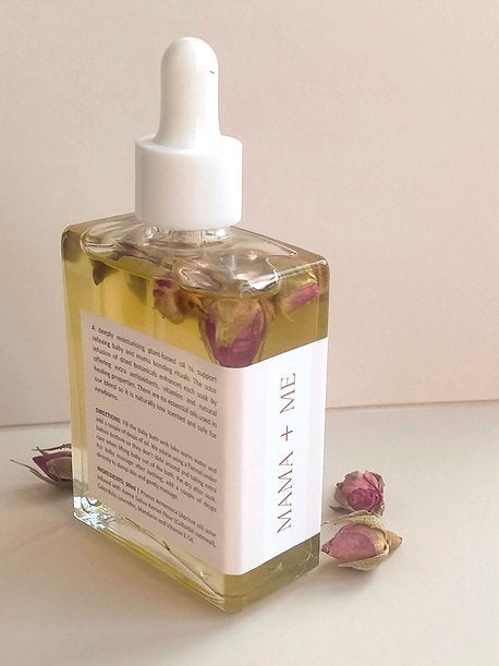 A deeply moisturising plant-based baby and bath oil to support relaxing mama and baby bonding rituals. The solar infusion of dried botanicals enhances each soak by offering extra antioxidants, vitamins and natural healing properties. There are no essential oils used in our blend so it's naturally low scented and safe for newborns.